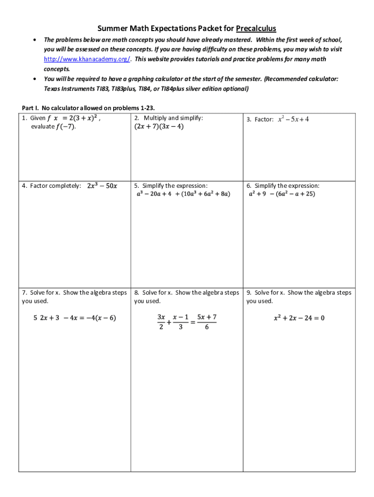 Summer Math Expectations Packet for Precalculus The problems below are math concepts you should have already mastered. Within the first week of school, you will be assessed on these concepts. If you