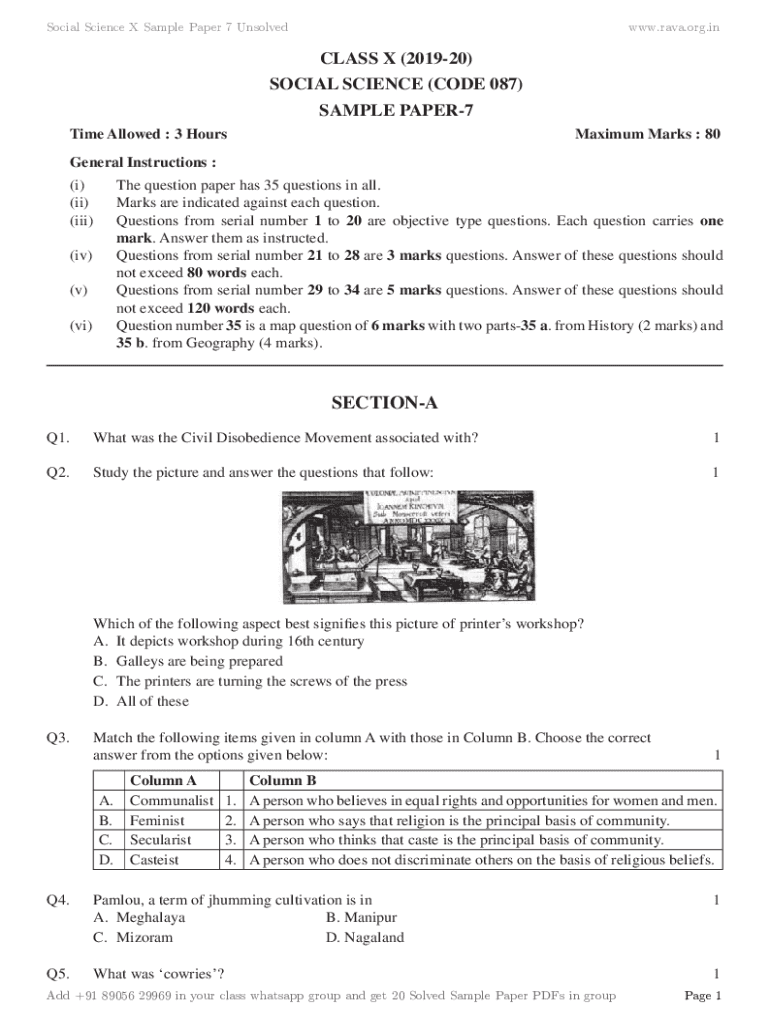 Get the free Social Science X Sample Paper 7 Unsolved - CBSE Online