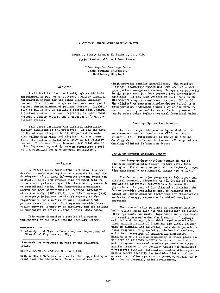 A CLINICAL INFORMATION DISPLAY SYSTEM Bruce J. Blum, * Raymond E. Lenard, Jr., M.D. Hayden Brain, M.D. and Anne KammerJohns Hopkins Oncology Center Johns Hopkins University Baltimore, MarylandAbstract