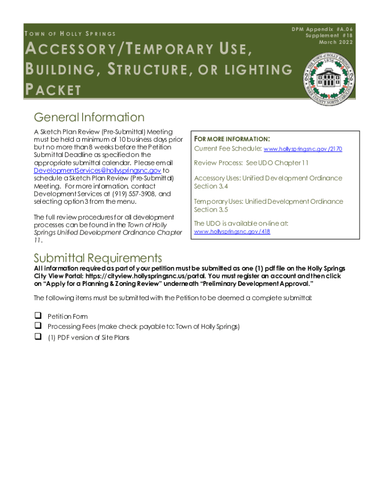 T OWNED M App end ix #A. 0 6 Sup p LEM ENT # 1 8 March 2 0 2 2HOLLY SP RINGS C E S S O R Y /T E MP OR A R Y U S E, B U I LD I N G, S T R U C T U R E, O R LI G H T I N G PACE T General Information