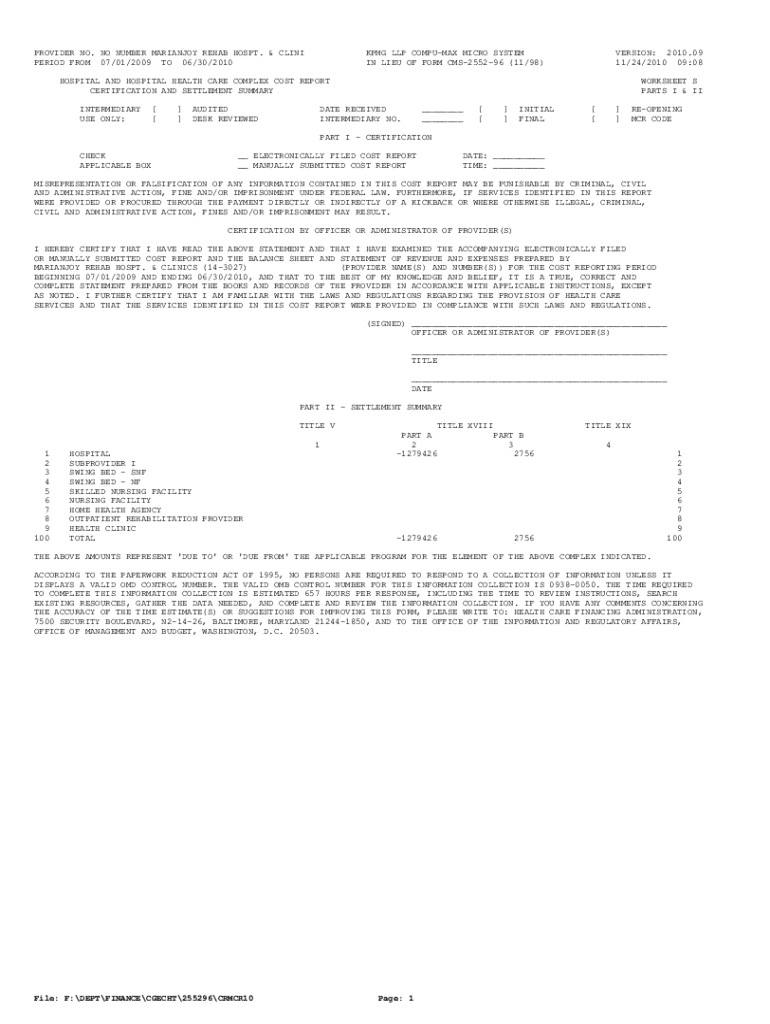 PROVIDER NO. NO NUMBER MARIANO REHAB HOST. & CLINIC