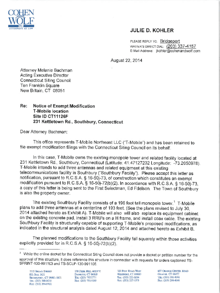 COHFNWOLF _P_ ATTORNEYS AT LAWSUIT D. KOHLER PLEASE REPLY TO: BfICIC@pOlt WRITER\'S DIRECT DIAL: ZO3 3374 57EMail Address: jkohler@cohenandwolf.comAugust 22, 2014 Attorney Melanie Bach man Acting