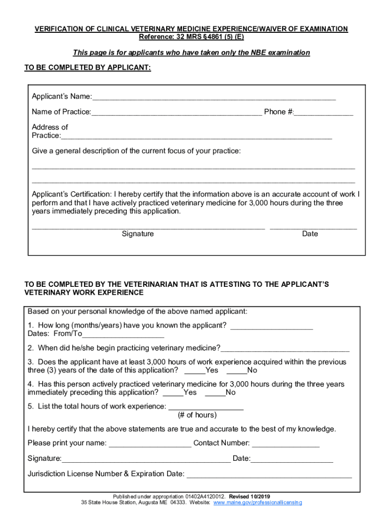 VERIFICATION OF CLINICAL VETERINARY MEDICINE EXPERIENCE/WAIVER OF EXAMINATION Reference: 32 MRS 4861 (5) (E)This page is for applicants who have taken only the BE examination TO BE COMPLETED BY APPLICANT:Applicants
