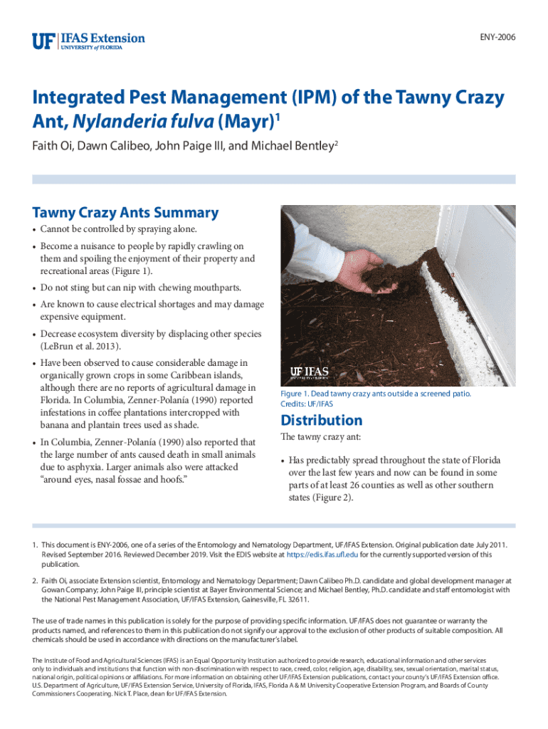 ENY2006Integrated Pest Management (IPM) of the Tawny Crazy Ant, Nylanderia vulva (May)1 Faith Oi, Dawn Caliber, John Paige III, and Michael Bentley2Tawny Crazy Ants Summary Cannot be controlled by