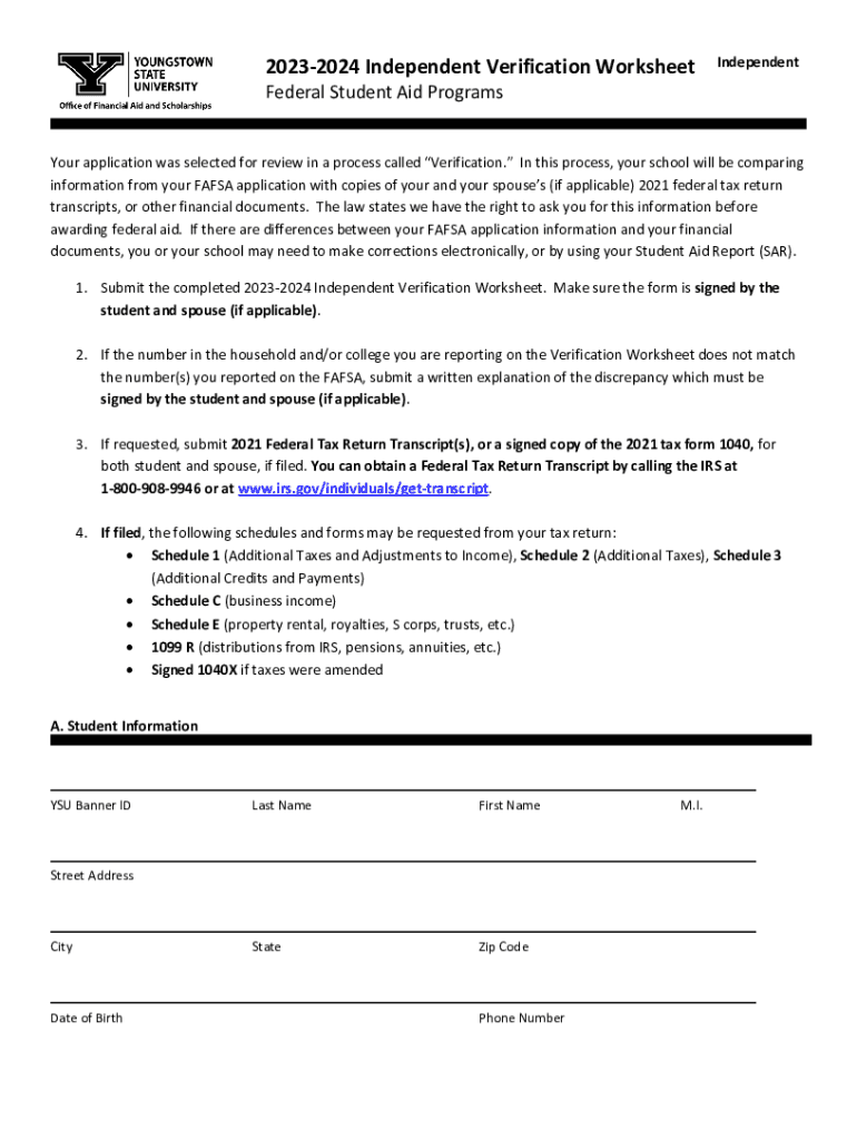 Get the free 2023-2024 Independent Verification Worksheet - cfweb cc ysu
