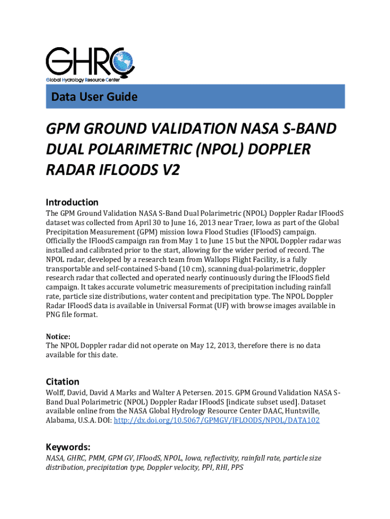 Data User Guide GPM GROUND VALIDATION NASA BAND DUAL COLORIMETRIC (NPL) DOPPLER RADAR FLOODS V2 Introduction The GPM Ground Validation NASA Band Dual Colorimetric (NPL) Doppler Radar Floods dataset