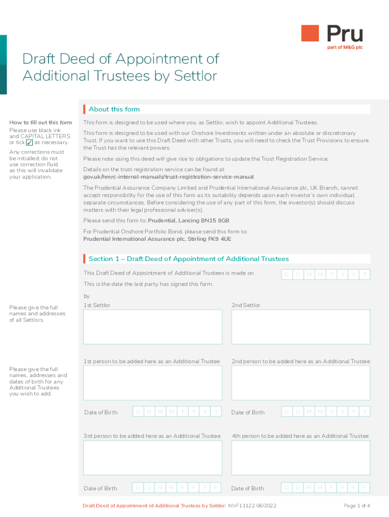 PRU's part of M&G redraft Deed of Appointment of Additional Trustees by Settler I About this form How to fill out this form Please use black ink and CAPITAL LETTERS or tick as necessary. Any corrections