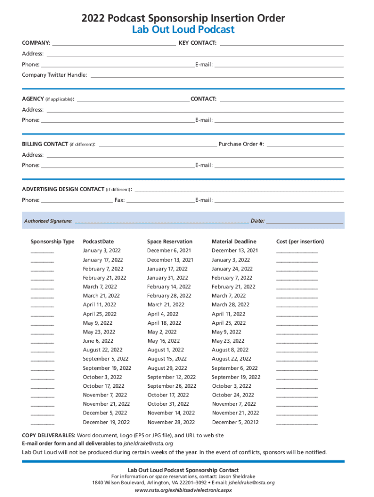 2022 Podcast Sponsorship Insertion Order Lab Out Loud Podcasthttp://laboutloud.podcast Profile Lab Out Loud is an NSA sponsored biweekly podcast, produced 11 months of the year. Lab Out Loud covers