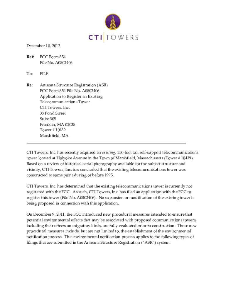 December10,2012 Ref: FCCForm854 File No. A0802406 To: FILE Re: AntennaStructureRegistration(ASR) FCCForm854FileNo. A0802406 ApplicationtoRegisteranExisting TelecommunicationsTower Customers, Inc.