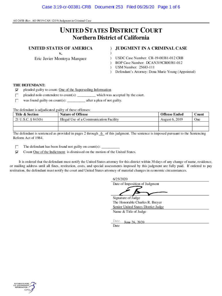 Case 3:19cr00381CRB Document 253 Filed 06/26/20-Page 1 of 6 AO 245B (Rev. AO 09/19CAN 12/19) Judgment in Criminal Reunited STATES DISTRICT COURT Northern District of California UNITED STATES OF AMERICA