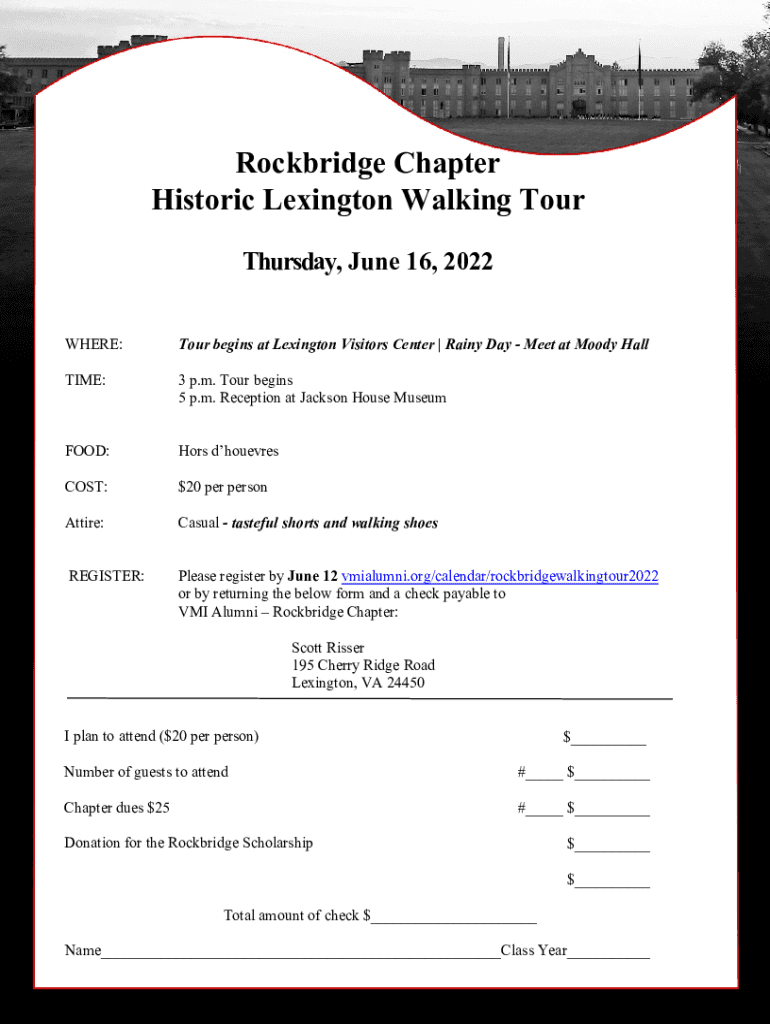 Rock bridge Chapter Historic Lexington Walking Tour Thursday, June 16, 2022, WHERE:Tour begins at Lexington Visitors Center | Rainy Day Meet at Moody Halftime:3 p.m. Tour begins 5 p.m. Reception at