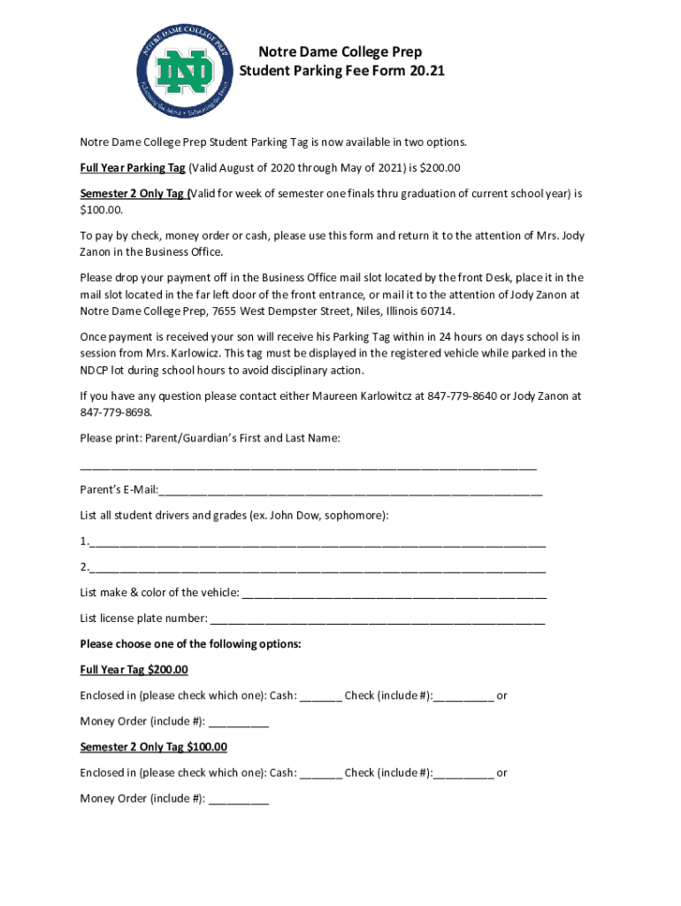 Notre Dame College Prep Student Parking Fee Form 20.21Notre Dame College Prep Student Parking Tag is now available in two options. Full Year Parking Tag (Valid August 2020 through May 2021) is $200.00