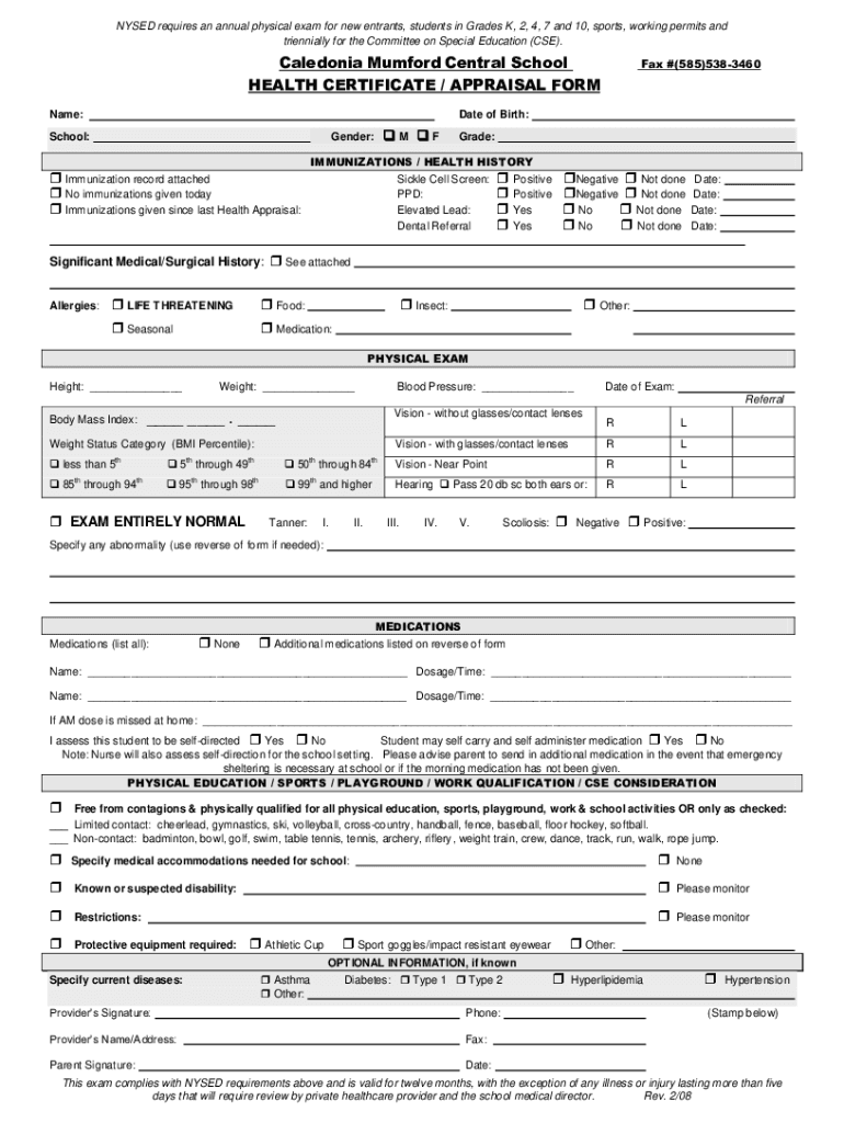 NOSED requires an annual physical exam for new entrants, students in Grades K, 2, 4, 7 and 10, sports, working permits and triennially for the Committee on Special Education (CSE). Caledonia Mumford