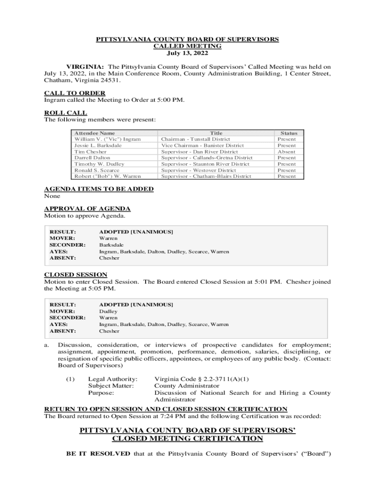 Get the free PITTSYLVANIA COUNTY BOARD OF SUPERVISORS' CLOSED ...
