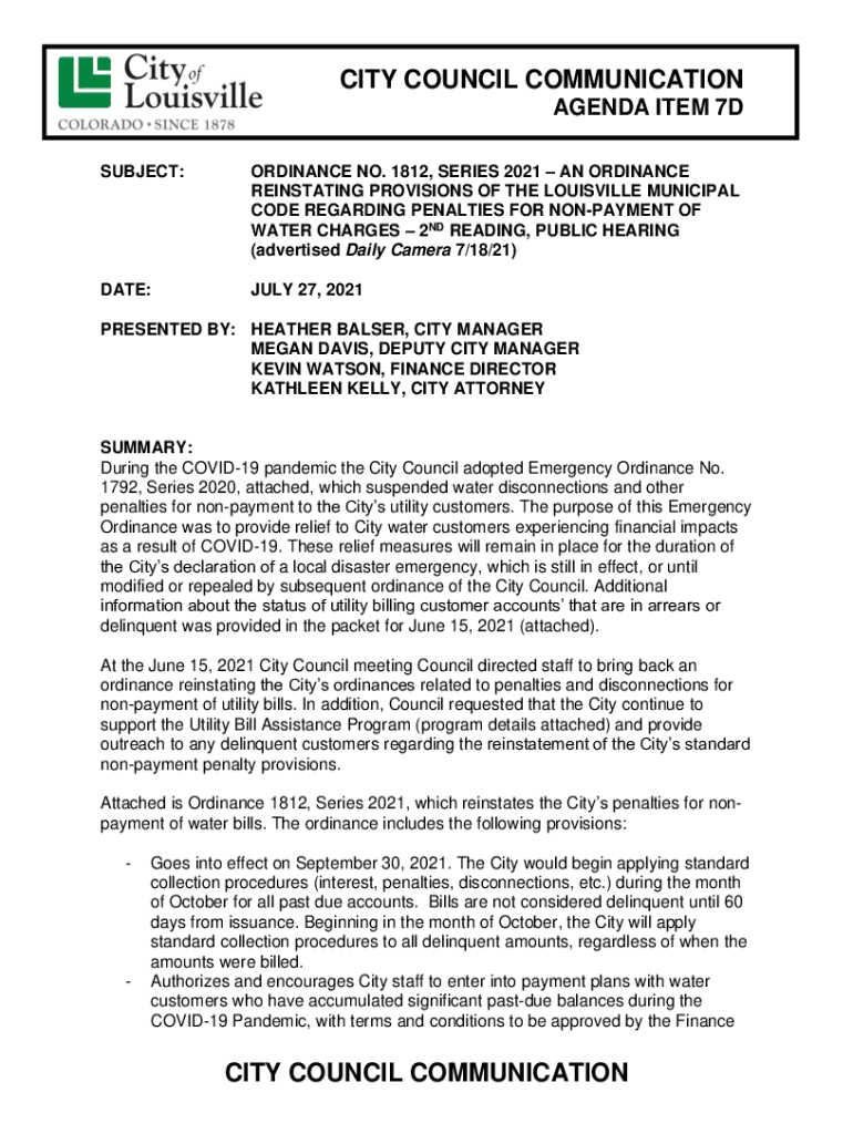CITY COUNCIL COMMUNICATION AGENDA ITEM 7D SUBJECT:ORDINANCE NO. 1812, SERIES 2021 AN ORDINANCE REINSTATING PROVISIONS OF THE LOUISVILLE MUNICIPAL CODE REGARDING PENALTIES FOR NONPAYMENT OF WATER CHARGES