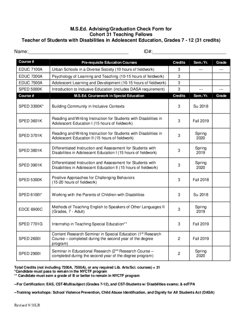 M.S. Ed. Advising/Graduation Check Form for Cohort 31 Teaching Fellows Teacher of Students with Disabilities in Adolescent Education, Grades 7 12 (31 credits) Name:___ Course #ID#:___Prerequisite