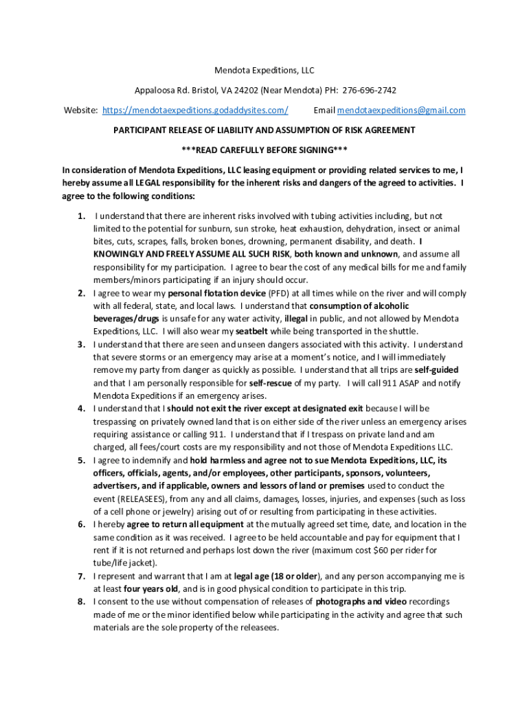 Mendoza Expeditions, LLC Appaloosa Rd. Bristol, VA 24202 (Near Mendoza) PH: 2766962742 Website: https://mendotaexpeditions.godaddysites.com/Email mendotaexpeditions@gmail.comPARTICIPANT RELEASE OF