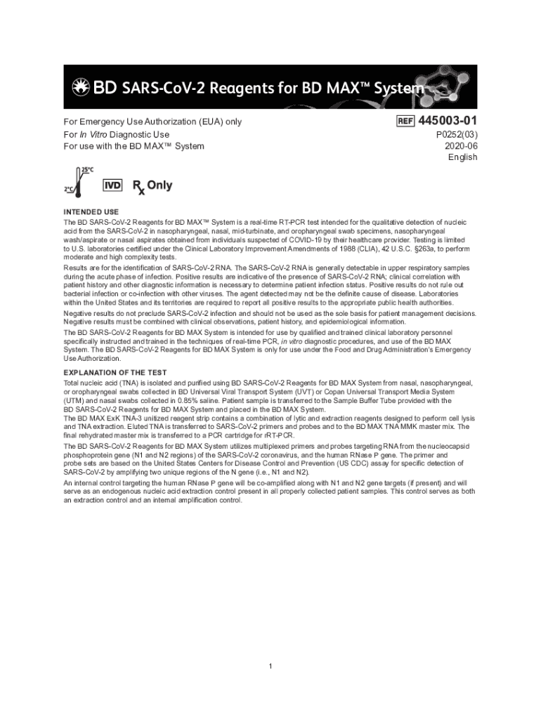 SARSCoV2 Reagents for BD MAX System Emergency Use Authorization (EUA) only44500301 For In Vitro Diagnostic UseP0252(03) For use with the BD MAX System 202006EnglishINTENDED USE The BD SARSCoV2 Reagents