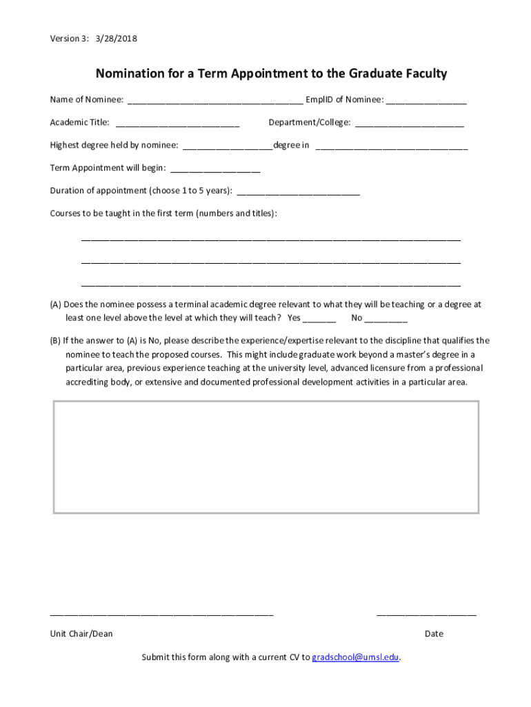 Version 3: 3/28/2018Nomination for a Term Appointment to the Graduate Faculty Name of Nominee: ___ Employ of Nominee: ___ Academic Title: ___Department/College: ___The Highest degree held by nominee: