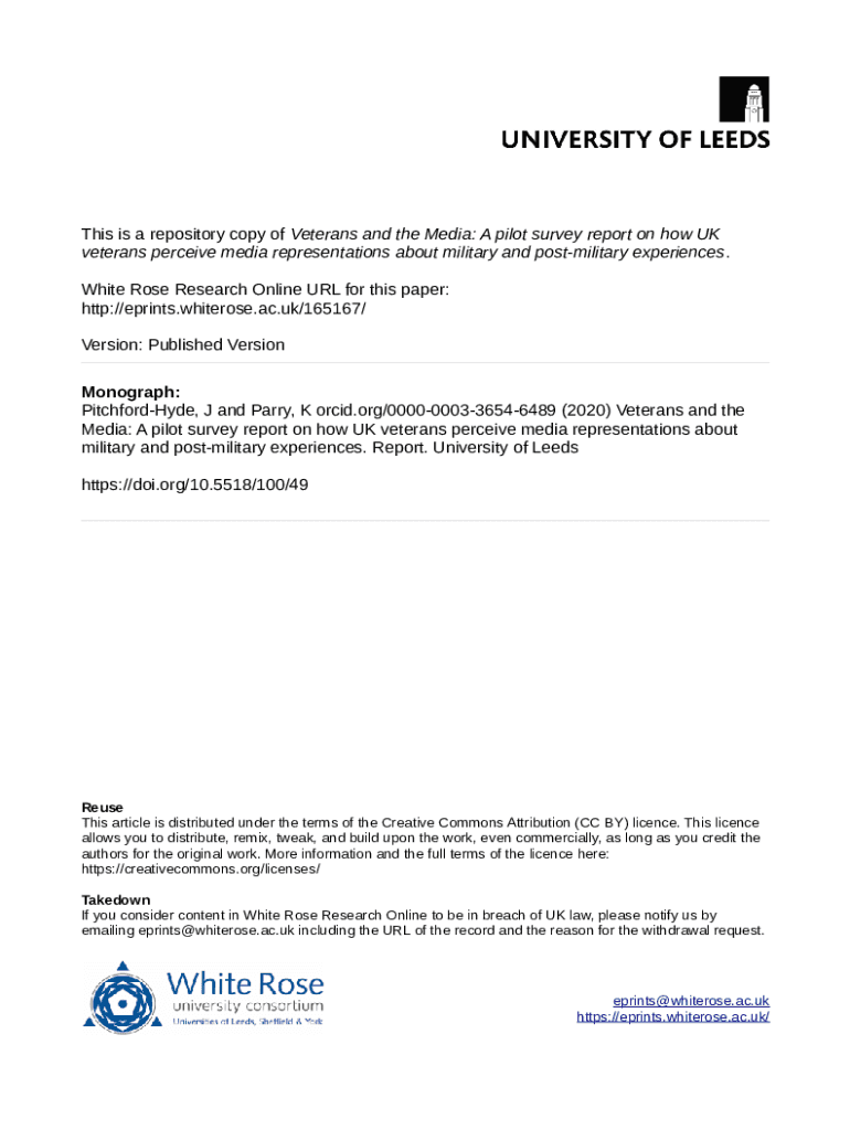 This is a repository copy of Veterans and the Media: A pilot survey report on how UK veterans perceive media representations about military and postmilitary experiences. White Rose Research Online