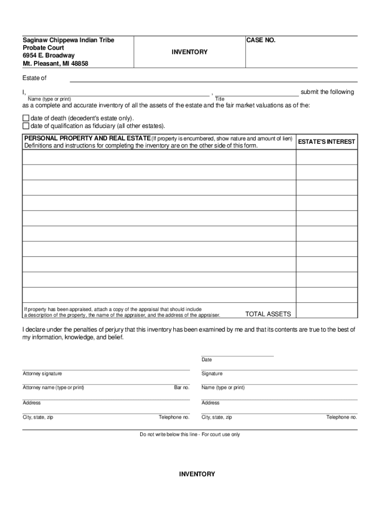 Saginaw Chippewa Indian Tribe Probate Court 6954 E. Broadway Mt. Pleasant, MI 48858CASE NO. INVENTORYEstate of I, submit the following, Name (type or print)Titles a complete and accurate inventory