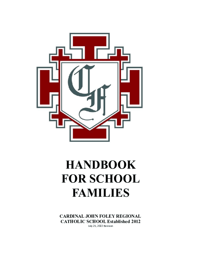 HANDBOOK FOR SCHOOL FAMILIES CARDINAL JOHN FOLEY REGIONAL CATHOLIC SCHOOL Established 2012 July 25, 2022, RevisionTABLE OF CONTENTS LETTER FROM THE PRINCIPAL7CARDINAL JOHN FOLEY REGIONAL CATHOLIC