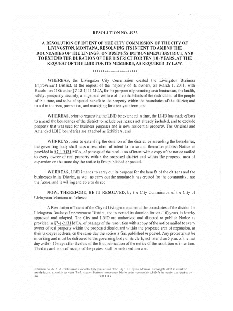 RESOLUTION NO. 4932 A RESOLUTION OF INTENT OF THE CITY OMMS JON OF THE CITY OF LIVINGSTON, MONTANA, RESOLVING IT INTENT TO AMEND THE BOUNDARIES OF THE LIVING TON BUSING S IMPROVEMENT DISTRICT, AND