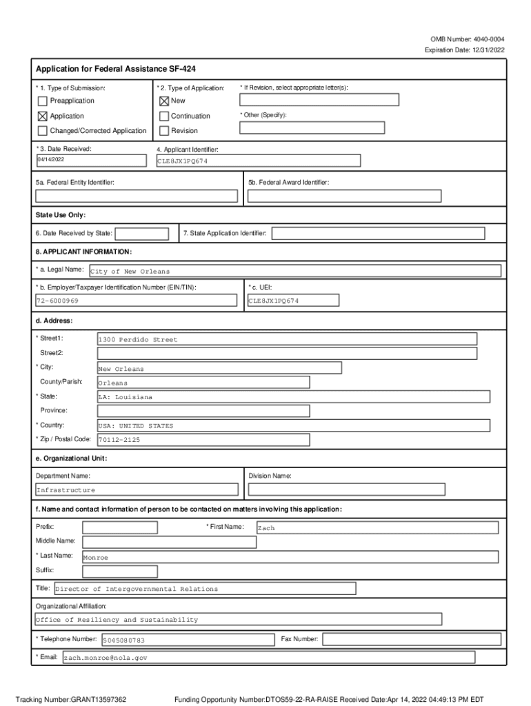 OMB Number: 40400004 Expiration Date: 12/31/2022Application for Federal Assistance SF424 * 1. Type of Submission:* 2. Type of Application:PreapplicationNewApplicationContinuationChanged/Corrected