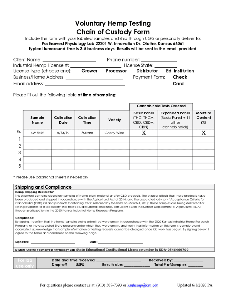 Voluntary Hemp Testing Chain of Custody Form Include this form with your labeled samples and ship through USPS or personally deliver to: Postharvest Physiology Lab 22201 W. Innovation Dr. Olathe,