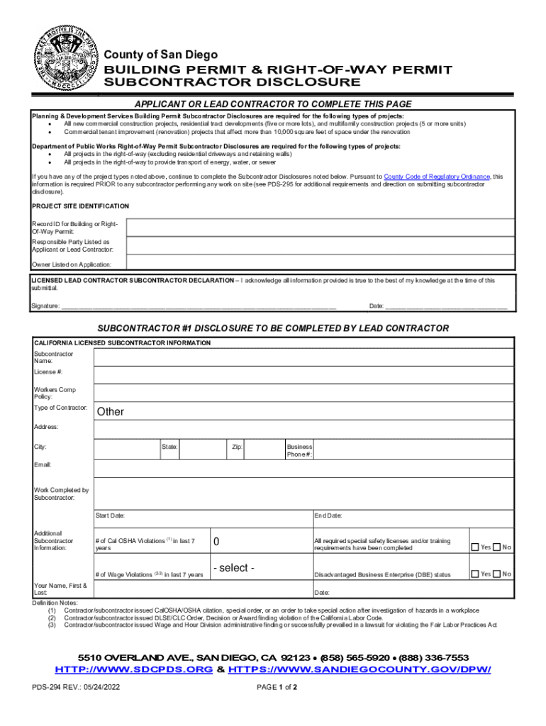 County of San DiegoBUILDING PERMIT & RIGHTOFWAY PERMIT SUBCONTRACTOR DISCLOSURE APPLICANT OR LEAD CONTRACTOR TO COMPLETE THIS PAGE Planning & Development Services Building Permit Subcontractor Disclosures