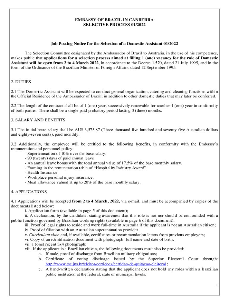 EMBASSY OF BRAZIL IN CANBERRA SELECTIVE PROCESS 01/2022Job Posting Notice for the Selection of a Domestic Assistant 01/2022 The Selection Committee designated by the Ambassador of Brazil to Australia,