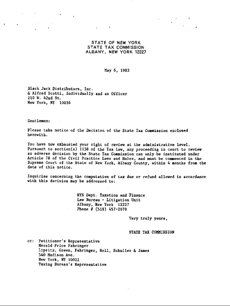 S TATE OF NETWORK STATE TAX COMMISSION A L B ANY, NETWORK 12227May 6, 1983Black Jack Distributors, Inc. & Alfred Scott, individually and as Officer 210 W. 42nd St. Lew York, fly 10036Geatlemen: Please