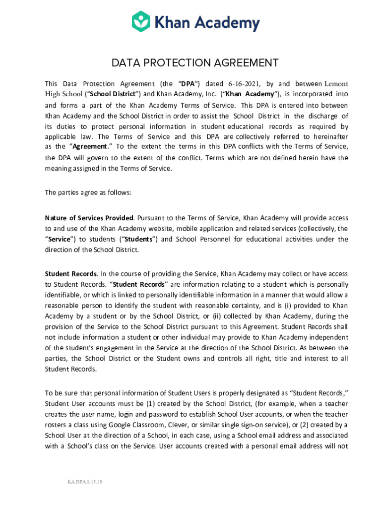 DATA PROTECTION AGREEMENT This Data Protection Agreement (the DPA) dated 6162021, by and between Lemont High School (School District) and Khan Academy, Inc. (Khan Academy), is incorporated into and