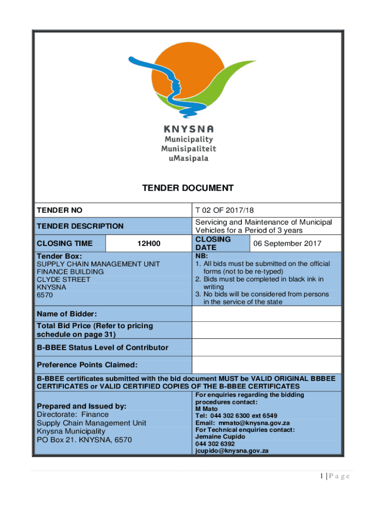 TENDER DOCUMENT TENDER NOT 02 OF 2017/18TENDER DESCRIPTION CLOSING TIME12H00Tender Box: SUPPLY CHAIN MANAGEMENT UNIT FINANCE BUILDING CLYDE STREET KṚṢṆA 6570Servicing and Maintenance of Municipal