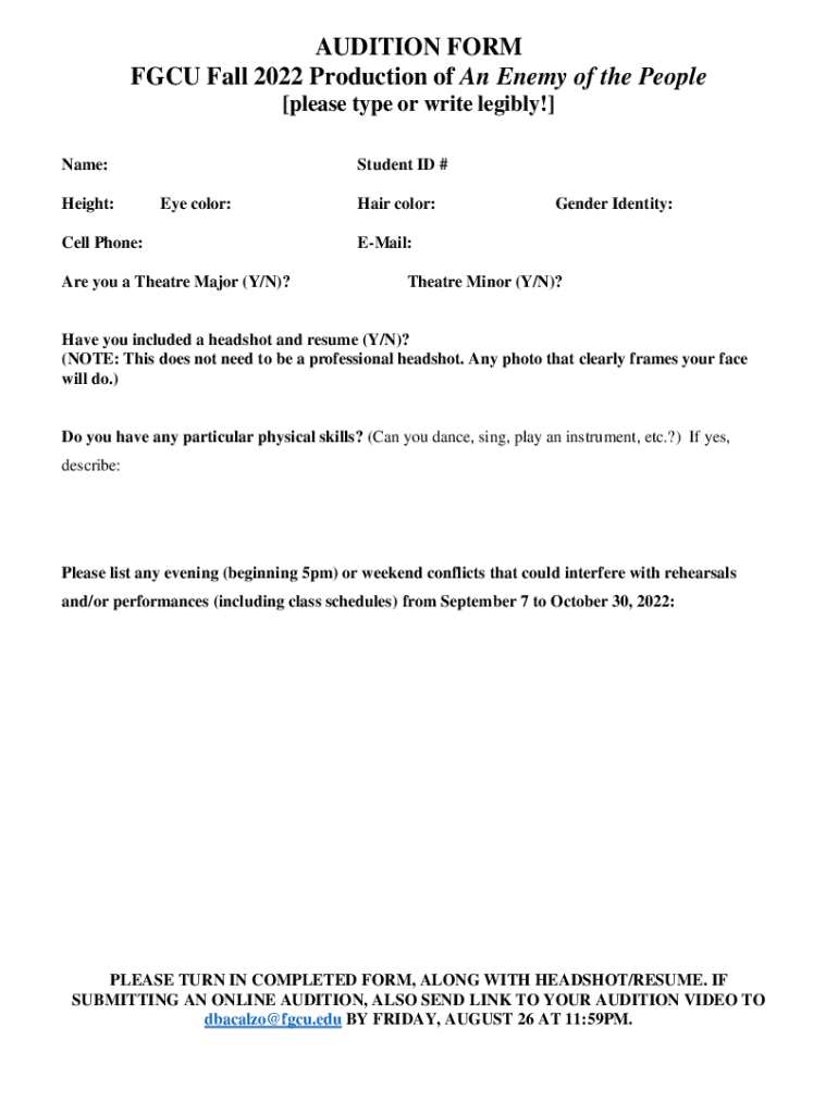 AUDITION FORM FGC Fall 2022 Production of An Enemy of the People [please type or write legibly!] Name: Height:Student ID # Eye color:Cell Phone: Are you a Theater Major (Y/N)? Hair color:Gender Identity:Email: