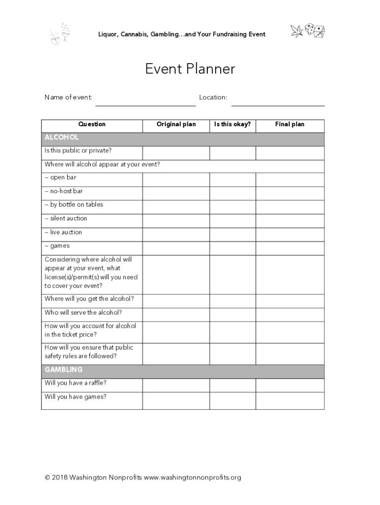 Liquor, Cannabis, Gambling, and You're Fundraising Seventeen Planner Names of event:QuestionLocation:Original plans this okay?ALCOHOL Is this public or private? Where will alcohol appear at your event?