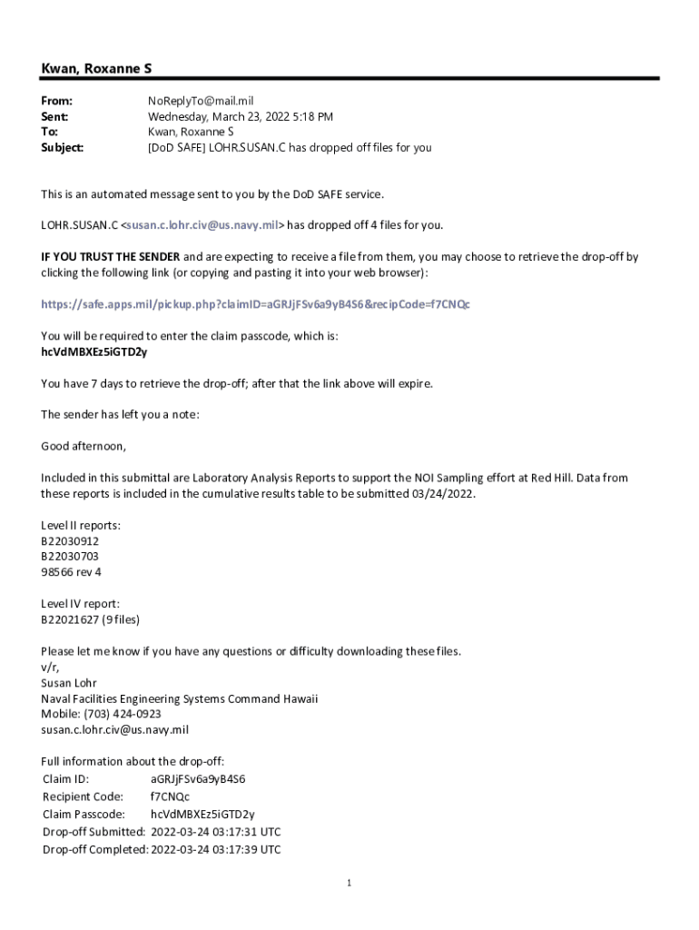 Kwan, Roxanne S From: Sent: To: Subject:NoReplyTo@mail.mil Wednesday, March 23, 2022 5:18 PM Kwan, Roxanne S [DoD SAFE] BOHR.SUSAN. C has dropped off files for youThisisanautomatedmessagesenttoyoubytheDoDSAFEservice.