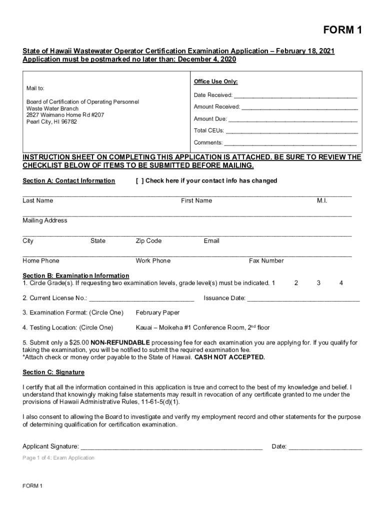 FORM 1 State of Hawaii Wastewater Operator Certification Examination Application February 18, 2021, Application must be postmarked no later than: December 4, 2020, Office Use Only:Mail to: Board of