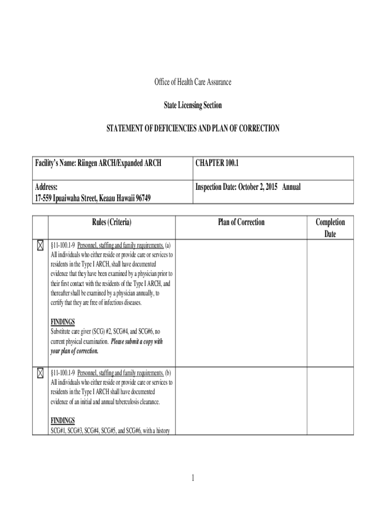 Office of Health Care Assurance State Licensing Section STATEMENT OF DEFICIENCIES AND PLAN OF CORRECTION Facilities Name: Ringed ARCH/Expanded ARCHCHAPTER 100.1Address: 17559 Ipuaiwaha Street, Keanu