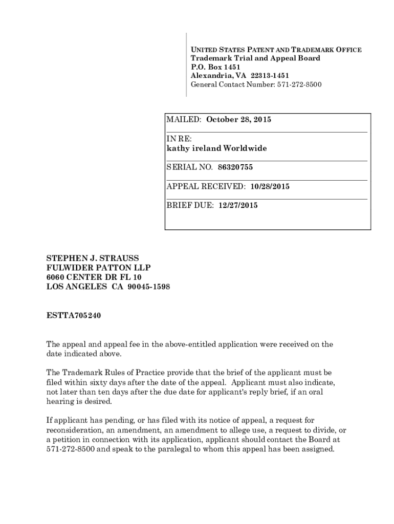 UNITED STATES PATENT AND TRADEMARK OFFICE Trademark Trial and Appeal Board P.O. Box 1451 Alexandria, VA 223131451 General Contact Number: 5712728500MAILED: October 28, 2015 ___ IN RE: Kathy Ireland