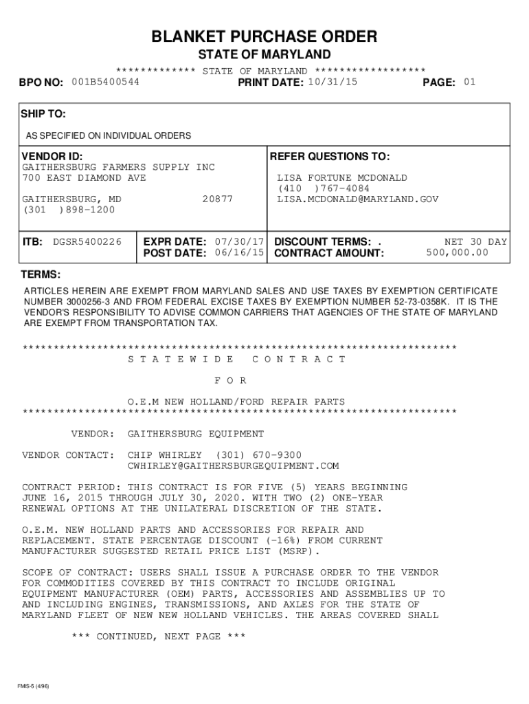 BLANKET PURCHASE ORDER STATE OF MARYLAND ************* STATE OF MARYLAND ****************** 001B5400544 BPO NO: PRINT DATE: 10/31/15 PAGE: 01 SHIP TO: AS SPECIFIED ON INDIVIDUAL ORDERSVENDOR ID: GAITHERSBURG