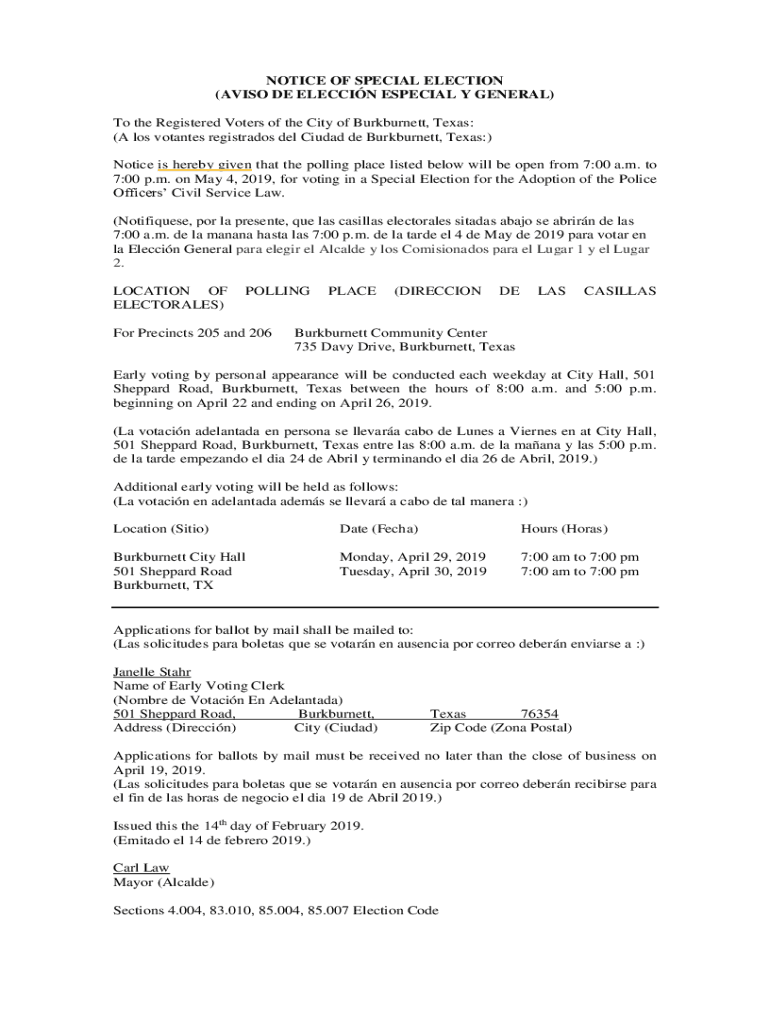 NOTICE OF SPECIAL ELECTION (AVIS ODE ELECTION ESPECIAL Y GENERAL) To the Registered Voters of the City of Burkburnett, Texas: (A Los rotates registrants Del Ciudad de Burkburnett, Texas:) Notice is