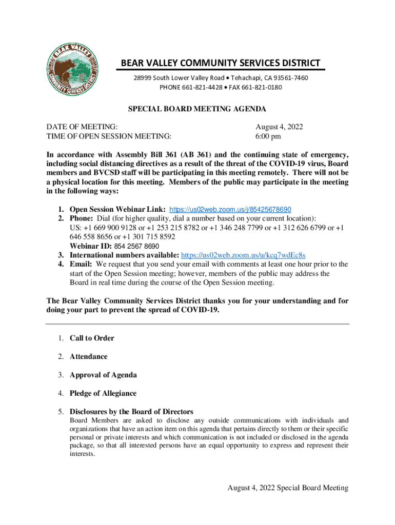 BEAR VALLEY COMMUNITY SERVICES DISTRICT 28999 South Lower Valley Road Tehachapi, CA 935617460 PHONE 6618214428 FAX 6618210180SPECIAL BOARD MEETING AGENDA DATE OF MEETING: TIME OF OPEN SESSION MEETING:August