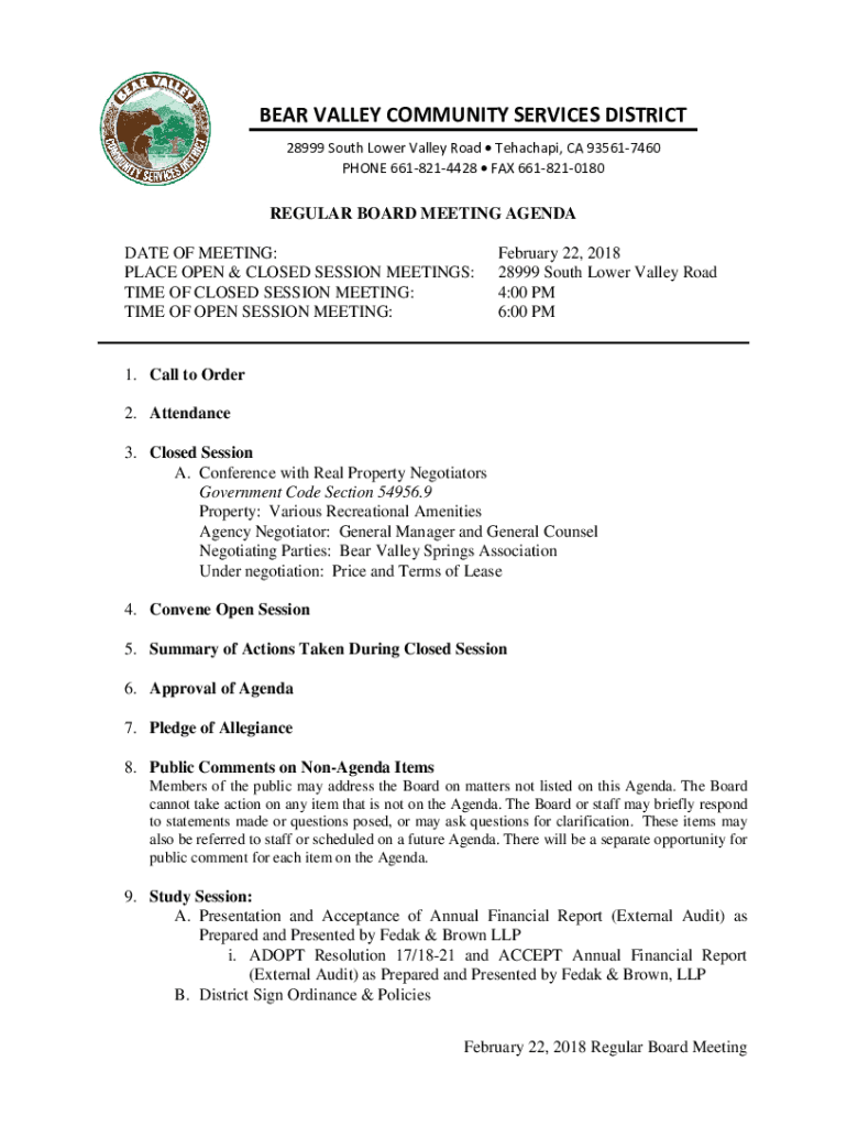 BEAR VALLEY COMMUNITY SERVICES DISTRICT 28999 South Lower Valley Road Tehachapi, CA 935617460 PHONE 6618214428 FAX 6618210180REGULAR BOARD MEETING AGENDA DATE OF MEETING: PLACE OPEN & CLOSED SESSION
