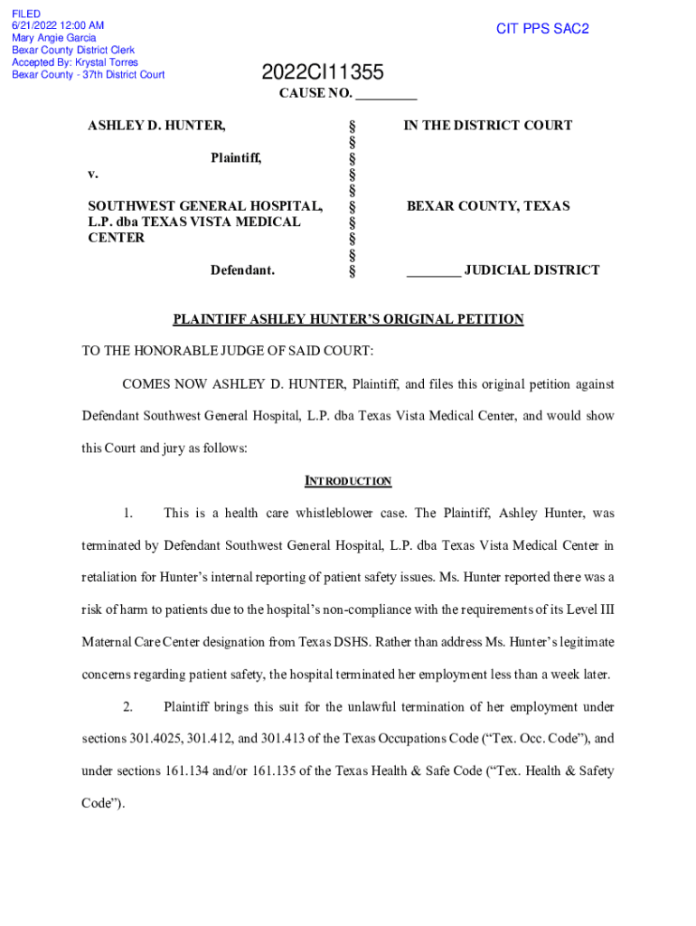 FILED 6/21/2022 12:00 AM Mary Angie Garcia Bexar County District Clerk Accepted By: Krystal Torres Bexar County 37th District Court CIT PPS SAC22022CI11355 CAUSE NO. ___ASHLEY D. HUNTER, Plaintiff,