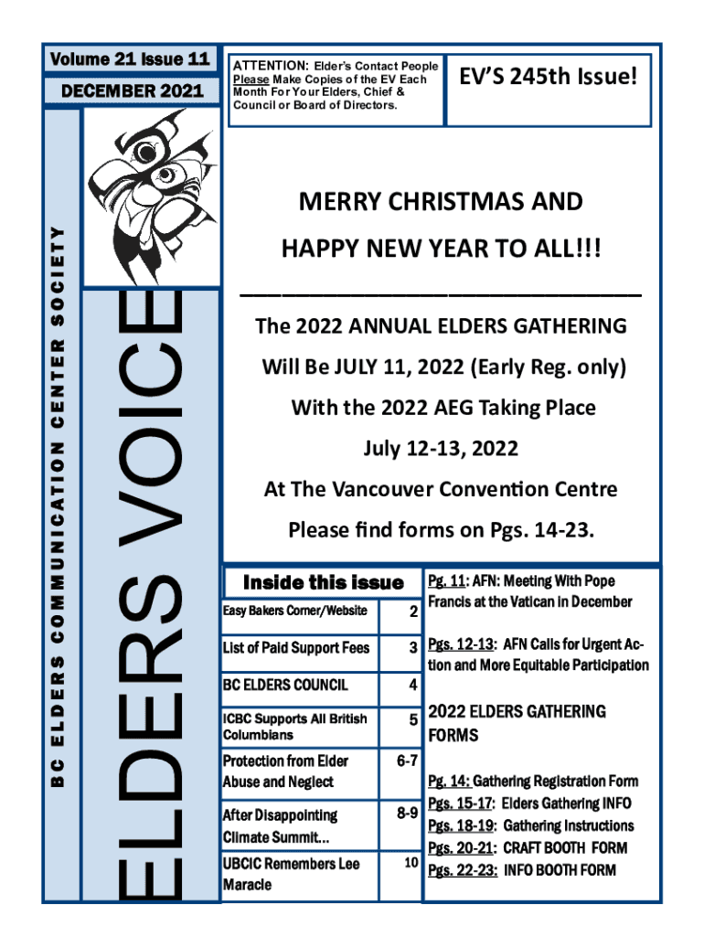 Issue BC ELDERS COMMUNICATION CENTER SOCIETY DECEMBER 2021Inside this issue. 11: AFN: Meeting With Pope Francis at the Vatican in Decembers Bakers Corner/Website2List of Paid Support Fees3 Pgs. 1213: