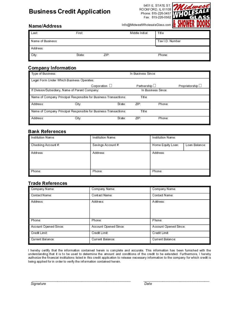 5401 E. STATE ST. ROCKFORD, IL 61108 Phone: 8152263457 Fax: 8152260562Business Credit Application Name/Address Last:Info@MidwestWholesaleGlass.comfiest:Middle Initial:Filename of Business:Tax I.D.