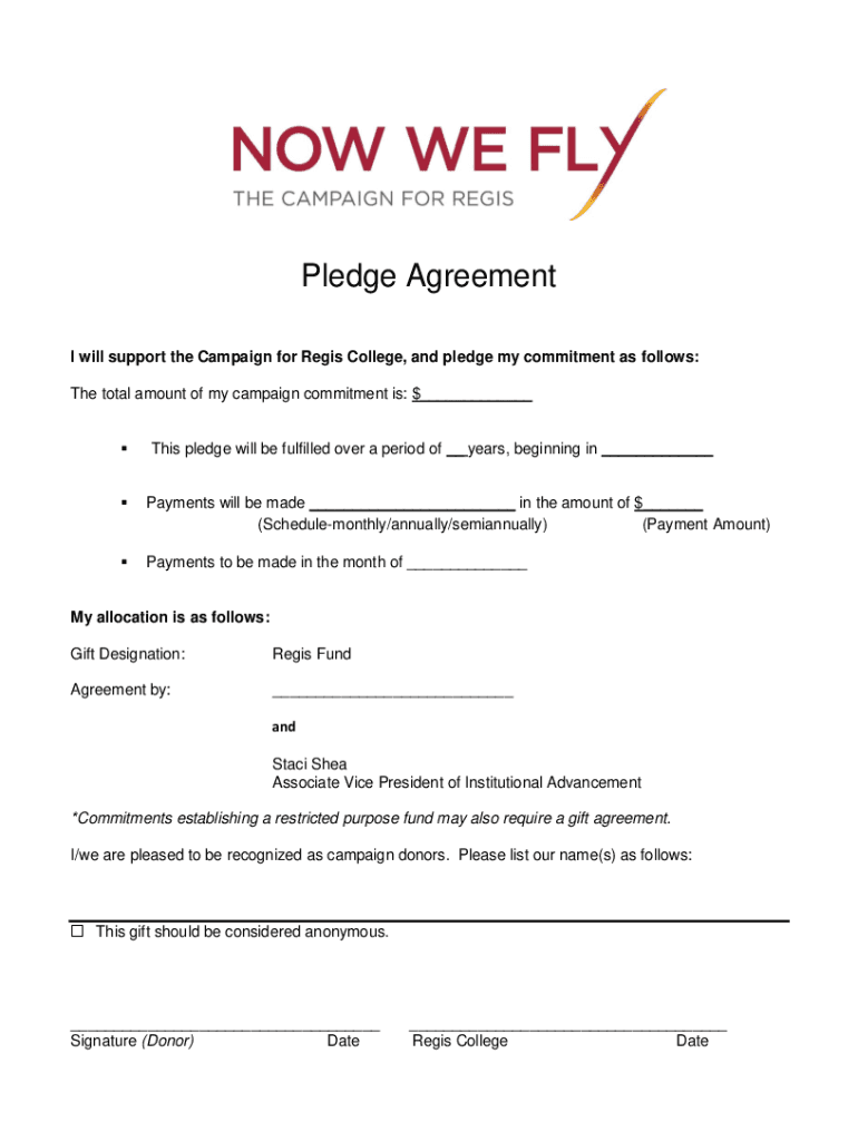 Pledge Agreement I will support the Campaign for Aegis College, and pledge my commitment as follows: The total amount of my campaign commitment is: $___ This pledge will be fulfilled over a period