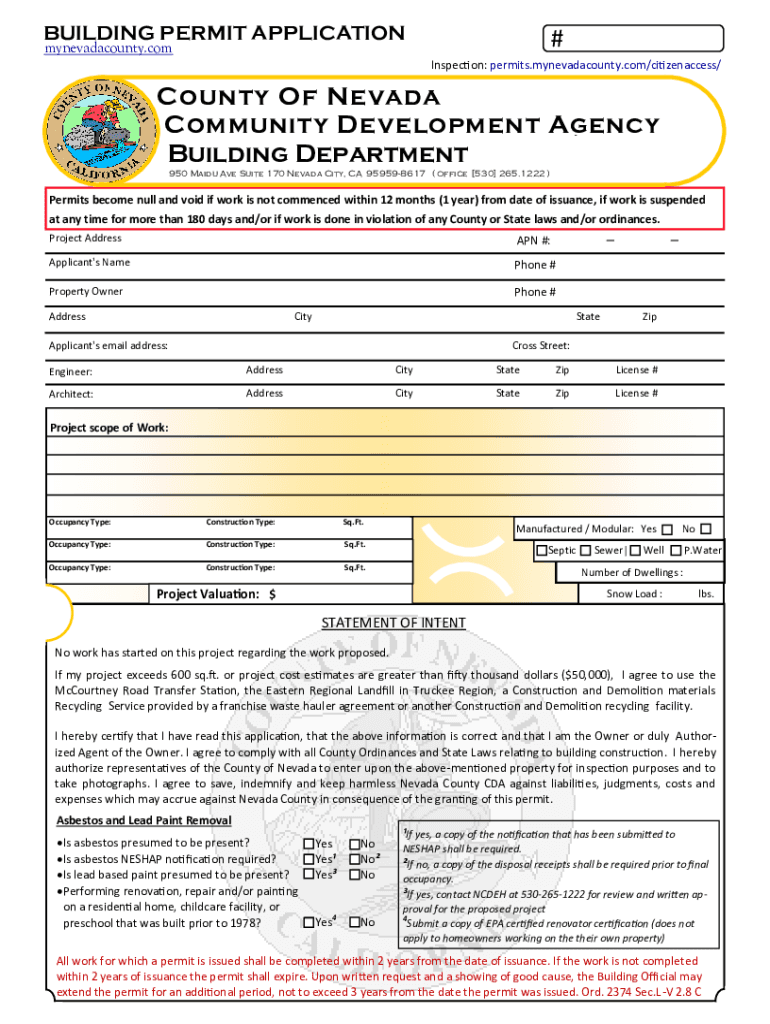 BUILDING PERMIT APPLICATION#mynevadacounty.inspection: permits.mynevadacounty.com/citizenaccess/County Of Nevada Community Development Agency Building Department 950 Maid Ave Suite 170 Nevada City,