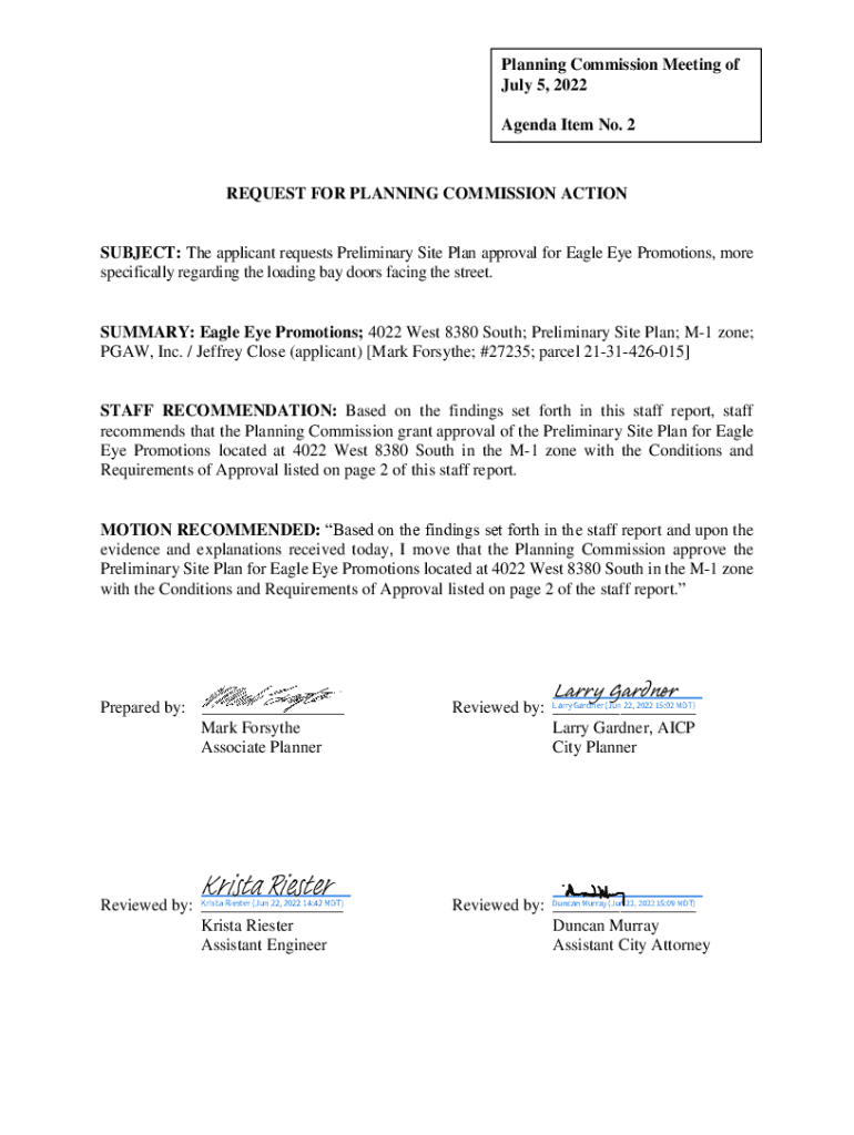 Planning Commission Meeting of July 5, 2022, Agenda Item No. 2REQUEST FOR PLANNING COMMISSION ACTIONSUBJECT: The applicant requests Preliminary Site Plan approval for Eagle Eye Promotions, more specifically